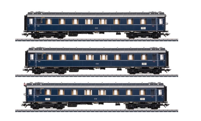 Das vorbildgerechte 3er Wagenset aus Reisezugwagen der Gruppe 28 stellt den "Dom Pfeil" der DB nach und ist mit Innen- und Zugschlussbeleuchtung ausgestattet.