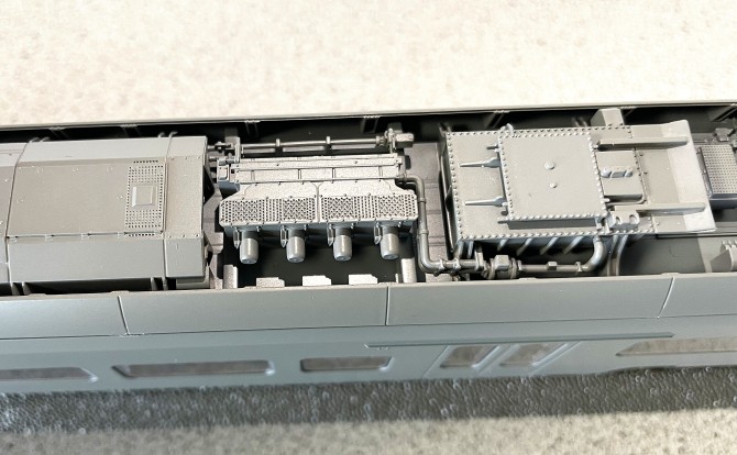Die speziell für dieses Modell neu entwickelten Pantografen sind äußerst filigran und - selbstredend - vorbildgerecht nachgebildet. Der Dachaufbau mit allen Aggregaten, die Wagenübergänge mit den Faltenbälgen und Verbindungsleitungen und auch der Fahrzeugboden werden hochdetailliert und variantengerecht ausgeführt sein.