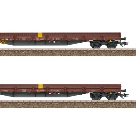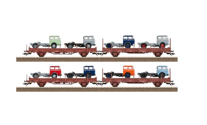 Dieses Set beinhaltet je zwei Wagen der Bauart Ks 3300 bzw. Ks 3301 der DR die jeweils zwei Zugmaschinen transportieren.